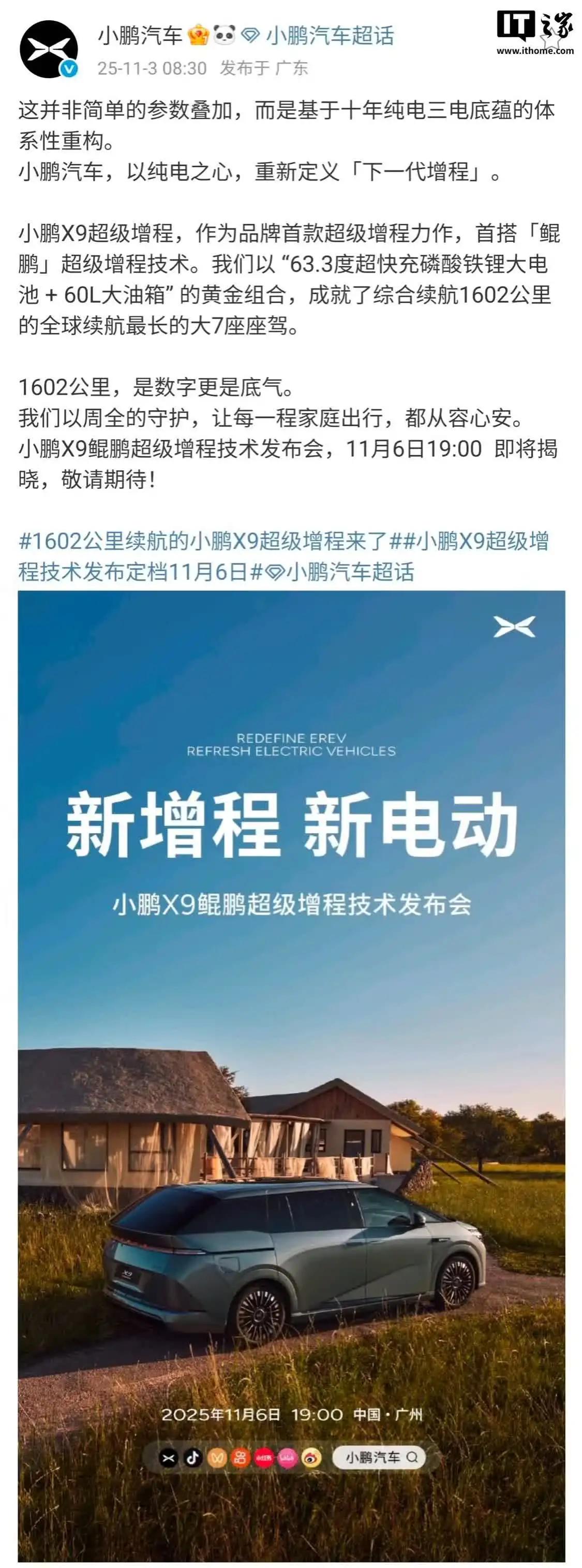 11 月 3 日消息,小鹏汽车今日宣布,小鹏 X9 鲲鹏超级增程技术发布会,11 月 6 日 19:00 即将揭晓。