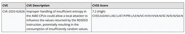 该缺陷会导致随机产生的数值错误地变成“0”,大幅降低系统的机密性和安全性,漏洞编号为CVE-2025-62626,CVSS评分7.2,被评估为“高严重性”。