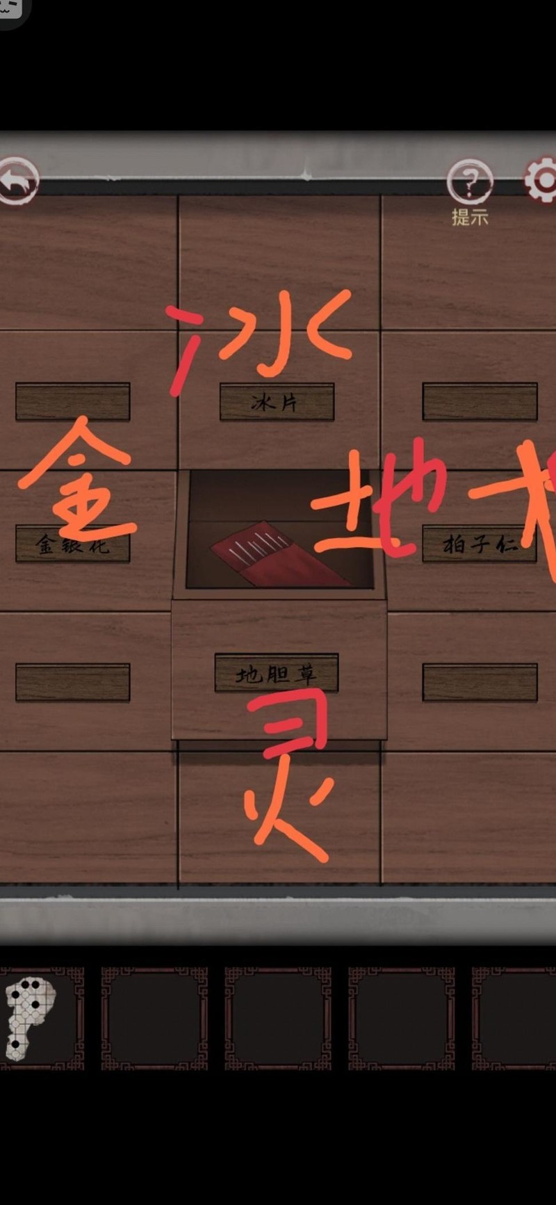 进门后先查看桌上书籍,按书中所述,将五味药材依方位摆放在墙上的药柜中。
