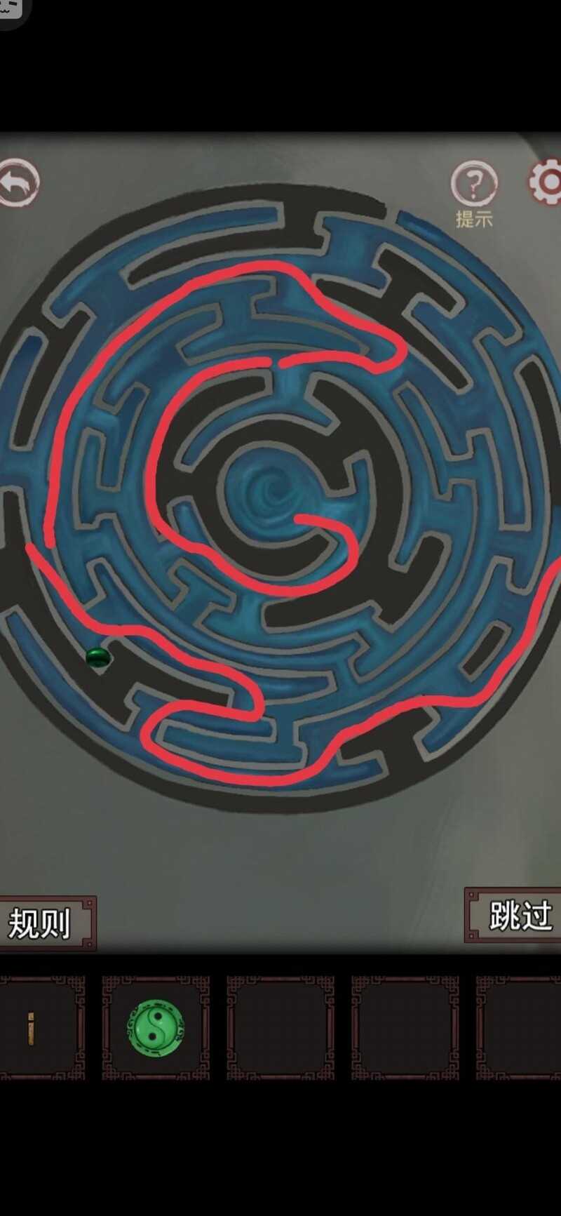 手持绿珠返回客厅,将珠子放入左侧假山装置以堵住水流。移动时需小心避免碰撞,尽量一口气多走几步,随后在安全处松手稍作休息。