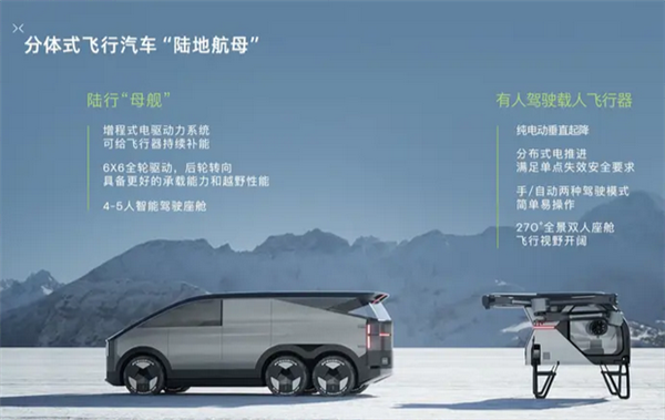 据了解,全球首款量产分体式飞行汽车 “陆地航母”,采用“陆行体+飞行器”分体设计,陆行体又被称作陆行“母舰”,采用三轴六轮设计,可实现6 x 6全轮驱动及后轮转向,可以独立使用,满足日常在城市道路中的通勤需求。