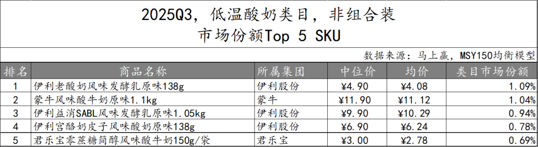 就低温酸奶非组合装产品市场份额TOP 5 SKU来看,伊利股份凭借多种风味和规格,有三款产品位列第一、第三和第四,蒙牛和君乐宝各有一款产品上榜。从产品特征来看,市场热销产品覆盖了以“零蔗糖”为卖点的健康型酸奶以及创新性的宫酪奶皮子风味,规格范围从150g小包装到1.1kg大容量不等。在低温酸奶非组合装市场,消费者在口味偏好、食用场景及健康导向上呈现出显著的多元化特征,而企业也正通过扩充产品矩阵,以精准响应不同细分人群的消费需求。