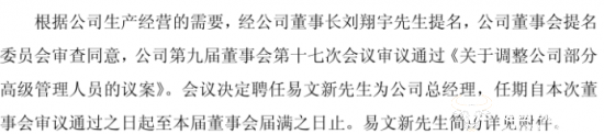 公告显示,惠泉啤酒原总经理刘翔宇因工作需要,申请辞去公司总经理职务,辞任后仍将继续担任公司董事长及董事会各专门委员会相关职务,而易文新被聘任为公司新任总经理。