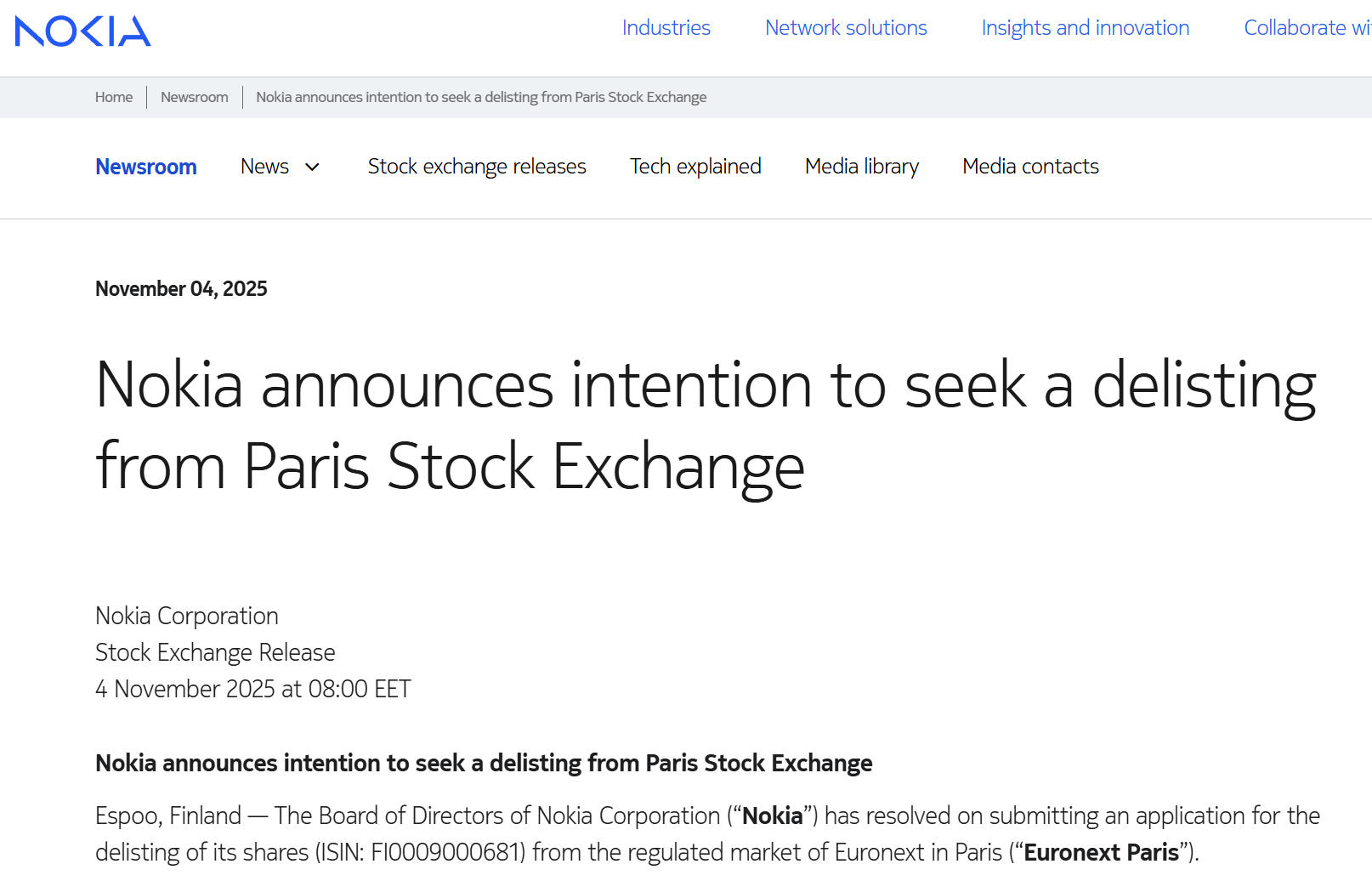 C114讯 11月4日消息(颜翊)诺基亚在官网发布公告称,董事会已决议,将向巴黎泛欧交易所(“Euronext Paris”)提交申请,请求将其股份从该交易所的监管市场退市。