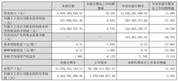 前三季度,公司实现营业收入 135.10 亿元,同比增长 11.68%;其中单季度营业收入 48.70 亿元,同比增长 10.55%,营收增长势头持续。利润方面,前三季累计归属于上市公司股东的净利润 4.68 亿元,同比下降 21.25%;但扣除非经常性损益后的净利润达 4.43 亿元,同比大幅增长 19.19%,核心盈利能力显著增强。基本每股收益 0.34 元,同比下降 27.66%;加权平均净资产收益率为 5.76%。第三季度单季度实现归母净利1.61亿元,同比微增0.63%。