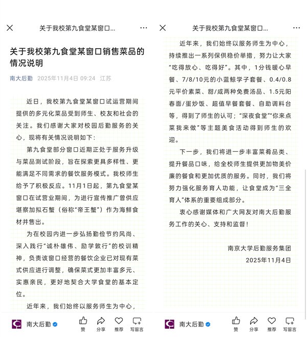 11月4日消息,据媒体报道,近日南京大学食堂推出999元的帝王蟹引发热议。今天,南大后勤通过微信公众号发布“关于我校第九食堂某窗口销售菜品的情况说明”。
