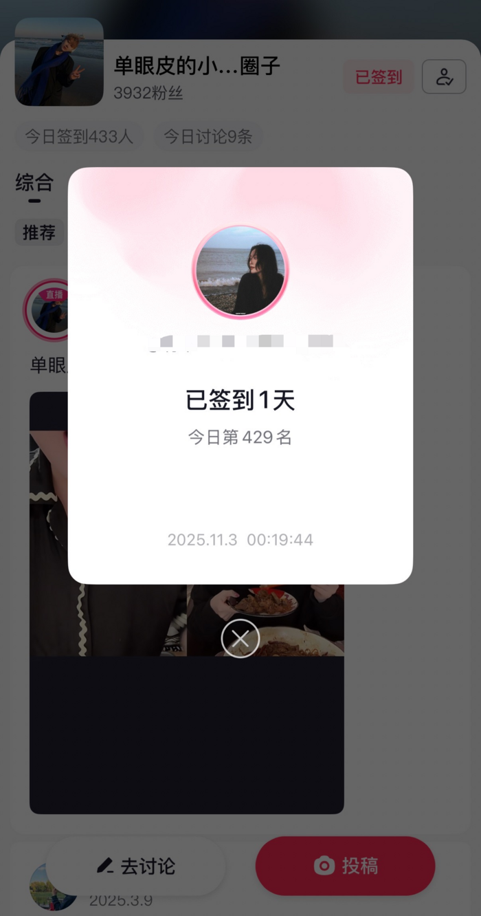 这一动作看似微小,实则是抖音在社交领域的进一步尝试。具体来看,“每日签到”可以用极低的参与成本培养用户的访问习惯,将短暂访问变为日常惯例。此外,用户可在粉丝圈子内集中浏览达人动态、直播录屏、幕后花絮等,无需搜索或跳转至其他App,将流量聚焦在站内,有效提升了信息的触达效率。