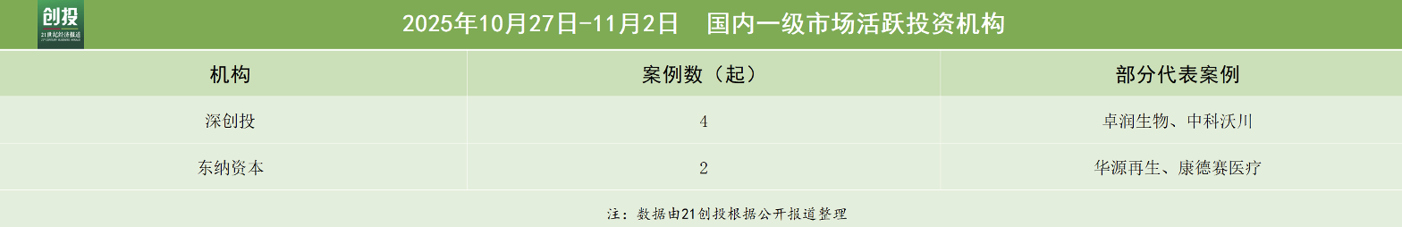 从机构投资活跃度来看,本周深创投与东纳资本较为活跃,分别完成4笔和2笔融资,主要聚集在科技与制造领域及医疗健康领域。