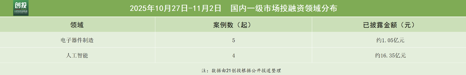 本周融资数量最多的行业领域仍是科技与制造。在三大行业领域的诸多赛道中,电子器件制造赛道完成5笔融资,融资金额约1.05亿元人民币;人工智能赛道完成4笔融资,披露的融资额约16.35亿元人民币。