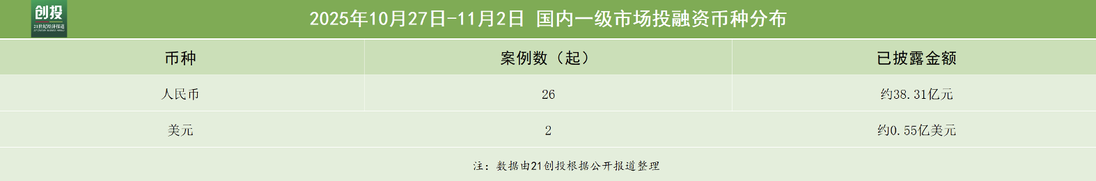21创投不完全统计10月27日—11月2日,报告日期内国内一级市场发生融资事件39起。其中,有28笔融资披露了融资金额和币种信息,总规模约合人民币42.44亿元人民币。