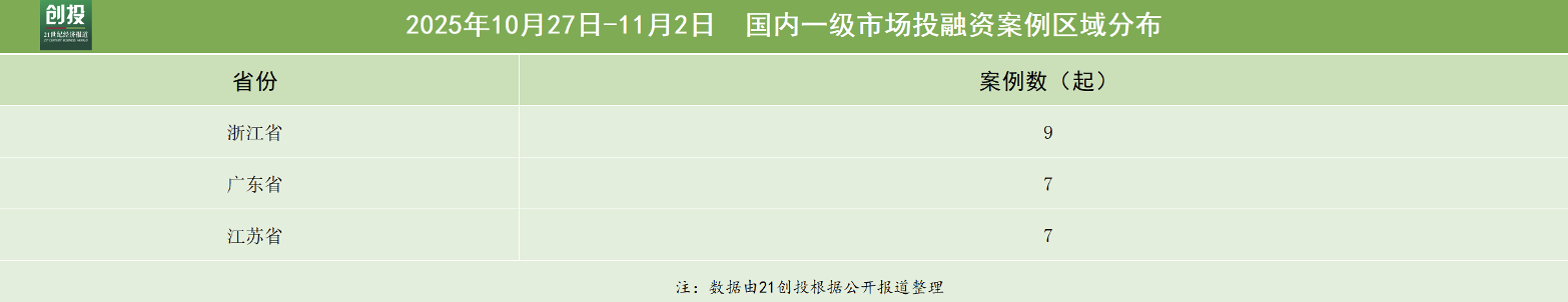 从披露获投企业的地域分布来看,本周的融资地区主要集中在浙江省、广东省和江苏省,分别完成9笔、7笔和7笔融资。