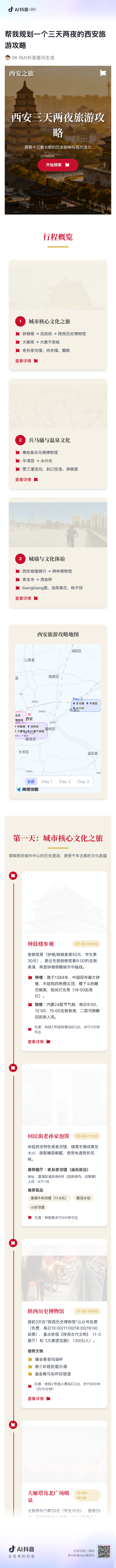 我们还尝试了一个更贴近普通用户需求的任务,比如输入「帮我规划一个三天两夜的西安旅游攻略」。
