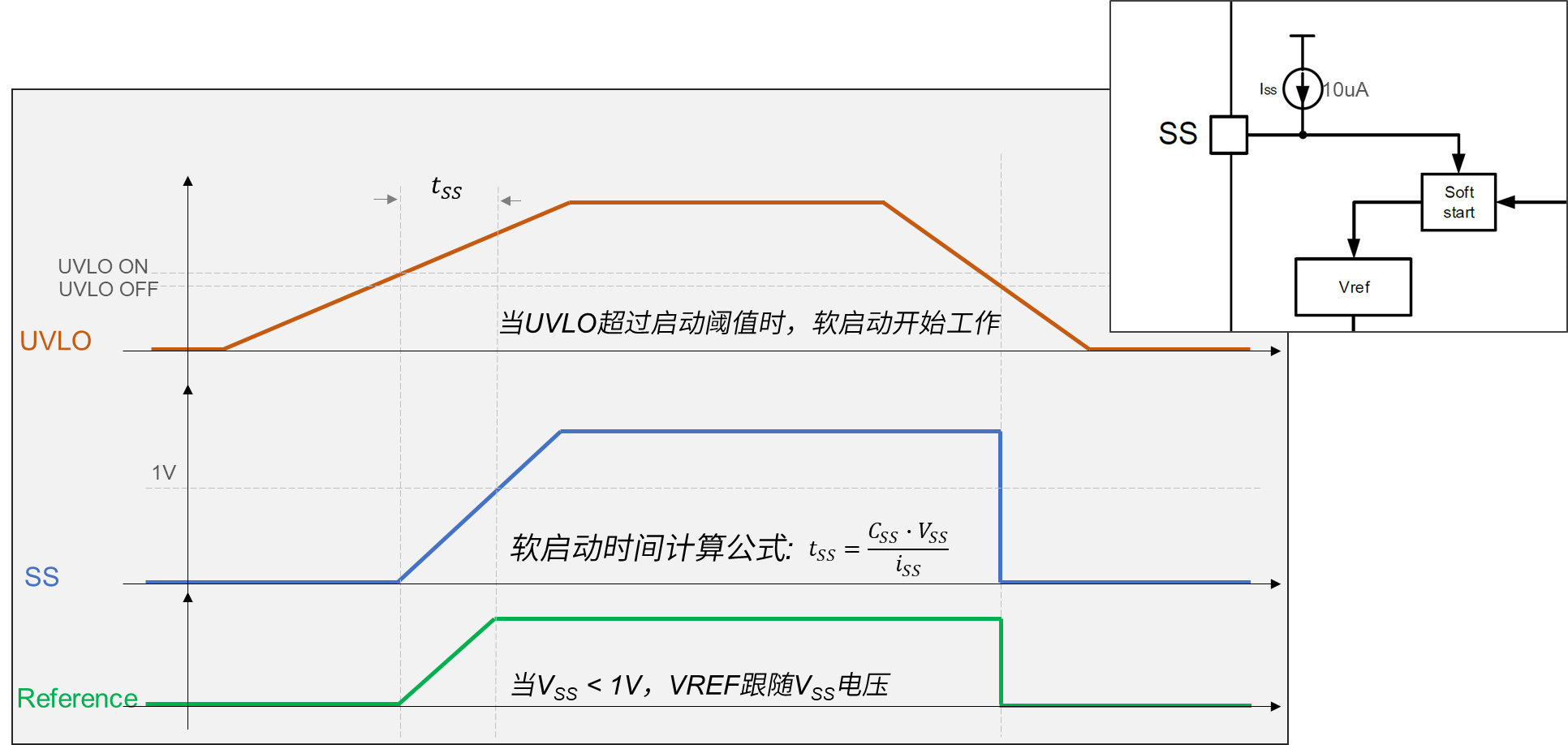 ● 通过SS引脚外接电容即可灵活设定软启动时间,控制输出上升斜率,在上电与启动阶段有效抑制浪涌电流,保护功率器件与后级负载稳定启动;