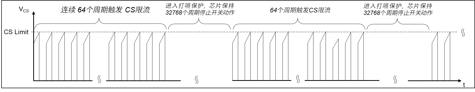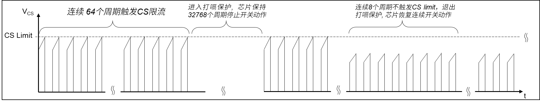 ● 触发条件:当连续64个开关周期检测到CS限流则会触发打嗝(Hiccup)保护,芯片保持32768个周期停止开关动作;当触发打嗝保护后,在不满足退出条件时,若累计有64个开关周期检测到CS限流,则仍会启动打嗝(Hiccup)保护。