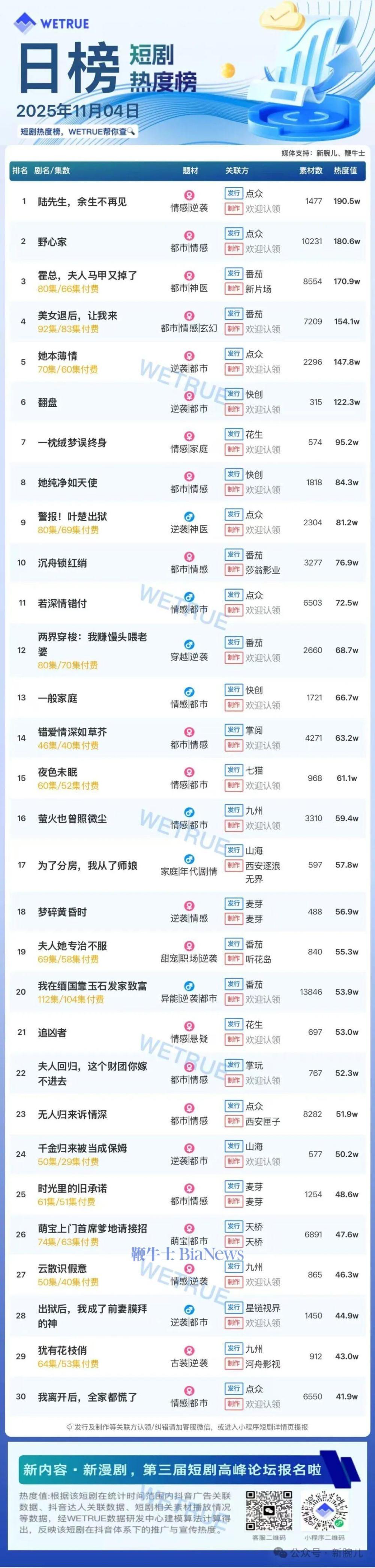 1、本日榜为WETRUE短剧数据公司提供,新腕儿和鞭牛士提供联合支持。