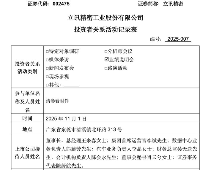 2025 年 11 月 1 日,立讯精密(证券代码:002475)在广东省东莞市清溪镇召开投资者关系交流会,披露 2025 年第三季度经营核心数据及业务布局进展。公司前三季度营收、归母净利润同比均增长超 24%,消费电子、汽车、AI 数据中心 “三驾马车” 协同增长,此前收购的莱尼(Leoni)、闻泰 ODM/OEM 资产整合成效超预期,为后续增长奠定坚实基础。