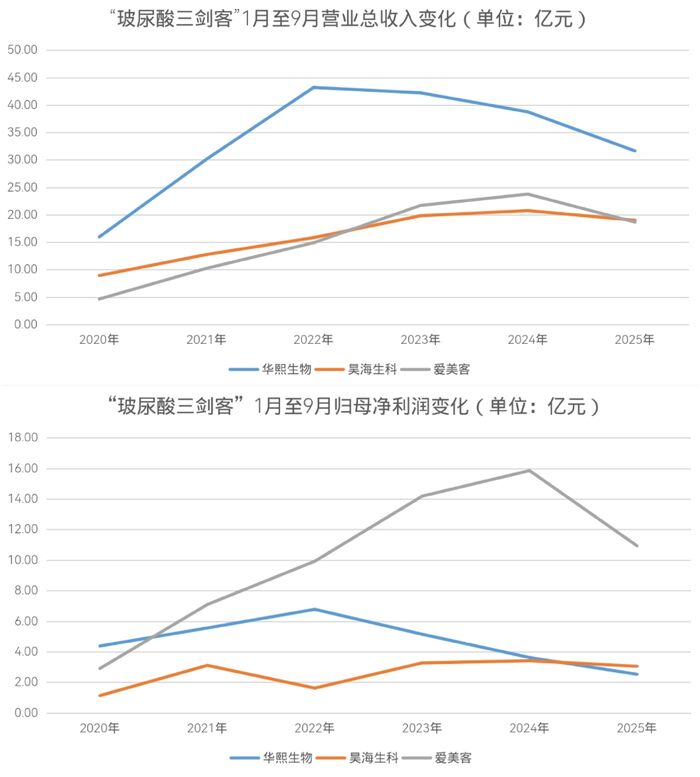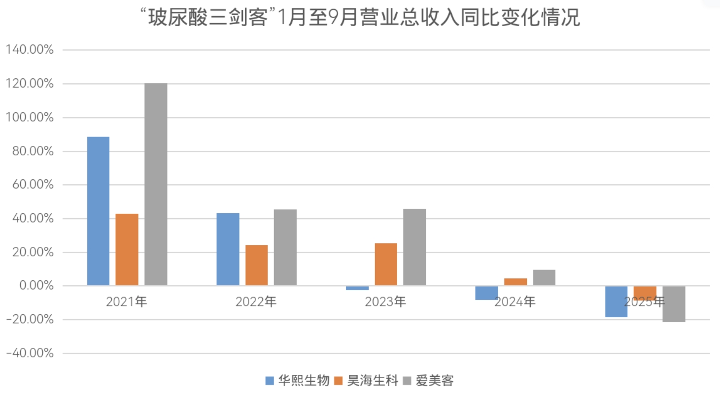【亿邦原创】2025年1至9月,“玻尿酸三剑客”——爱美客、华熙生物与昊海生科,首次集体出现营收和净利润的情况:三家企业的营业总收入和归母净利润均同比下滑。这也反映出当前医美行业整体正面临压力。