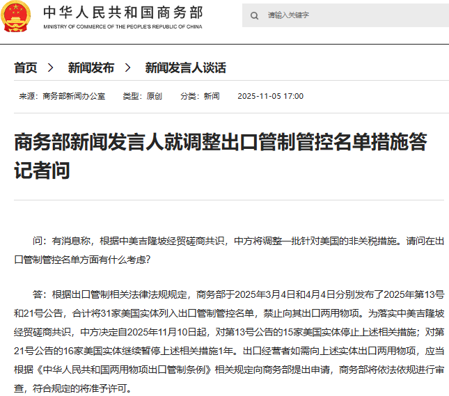 商务部新闻发言人就调整出口管制管控名单措施答记者问