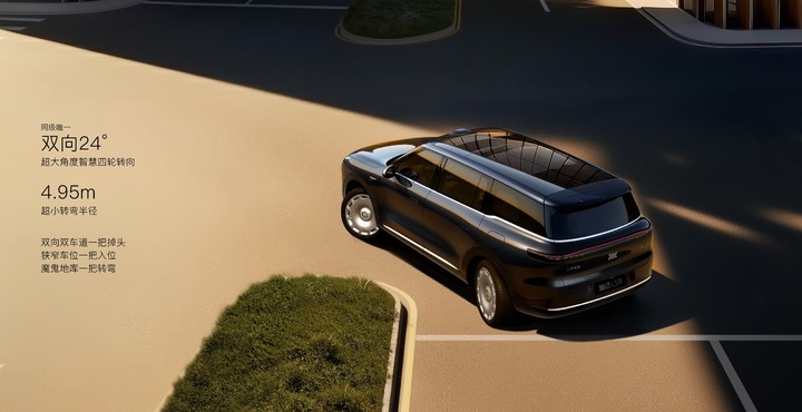 智己 LS9 的后轮转向角度也增加至了双向 24°,使这台长 5279mm,轴距 3160mm 的全尺寸 SUV 的转弯半径降低至了 4.95 米。