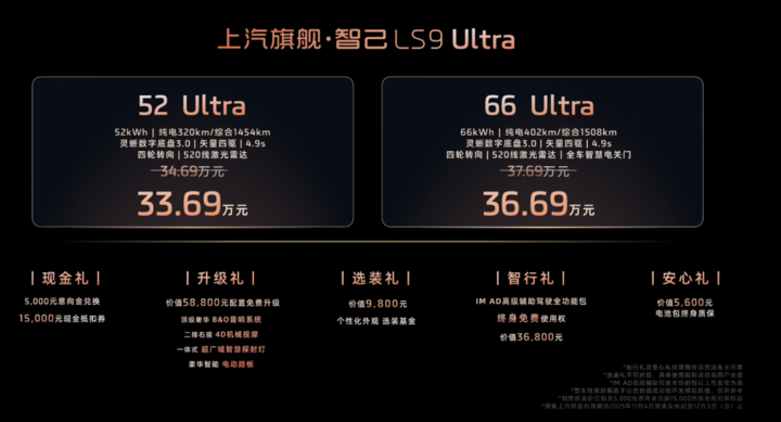 当然,离开价格讲配置都是耍流氓,智己此次公布了 52 度电版本和 66 度电版本的价格,分别为 33.59 万元和 36.69 万元。