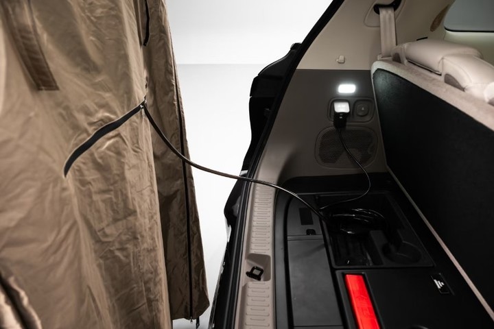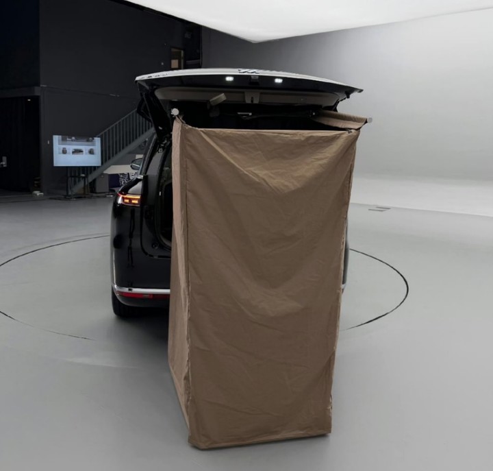 在选野奢户外套件后,智己 LS9 提供了一个可以悬挂于尾门之上的「单人简易淋浴房」,通过后备厢下沉空间内的 10 升水箱供水,接通车辆电源后,加热模块可以在 10 分钟内将水温升至 45℃。