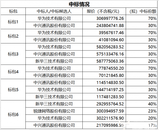 标包3中,华为拟中标50%份额;中兴通讯拟中标30%份额;新华三拟中标20%份额;各家报价接近。