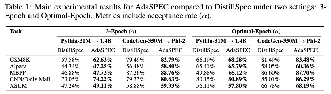 实验表明,AdaSPEC 在多种模型和任务上 consistently 提高 token 接受率(最高提升 15%),在保持生成质量的同时,有效释放了推测解码的加速潜力。