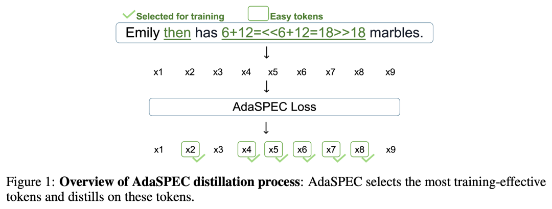 AdaSPEC 的核心思想是:在蒸馏阶段(如下图 1)识别并过滤难以学习的 token,让知识迁移更聚焦、更有效。