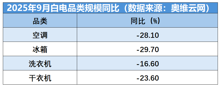 价格越拼越狠的背后,是行业大盘下行压力越来越大。根据奥维云网数据,2025年三季度单季度中国家电行业(不含3C)零售额达1,988亿元,同比下滑3.2%。2025年9月家电全品类(不含3C)零售额同比下滑19.2%。其中,空调零售额同比下滑28.1%,冰箱零售额同比下滑29.7%,洗衣机零售额同比下滑16.6%,就连蓝海细分品类干衣机,零售额也同比下滑23.6%。整体市场环境的寒意不言而喻。