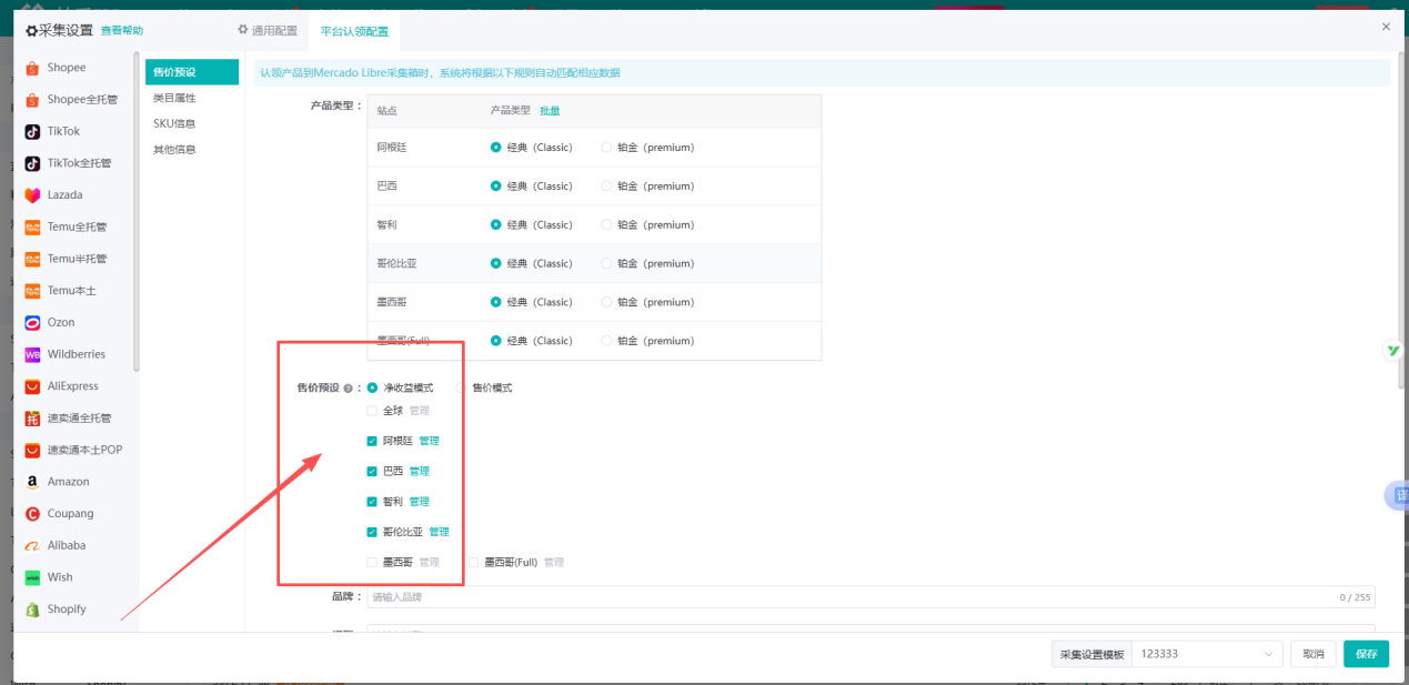 对于无货源卖家来说,若能在产品采集环节实现售价的自动设置,将极大提升运营效率。为此,妙手支持卖家在采集设置-Mercado Libre认领配置中,快速将售价预设为净收益模式。