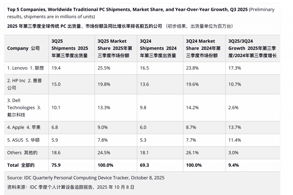 虽然都说笔记本和电脑是「夕阳产业」,这两年的出货量在全球范围内却明显有了复苏的情况。IDC数据显示,今年第三季度个人电脑出货量同比增长9.4%,增长势头强劲。