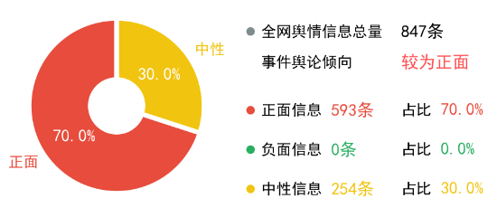 截止11月6日,此事件匹配的到全网舆情信息总量为847条,正面信息593条,占比70.0%,负面信息0条,占比0.0%,中性信息254条,占比30.0%,事件舆论呈现出较为正面的倾向。