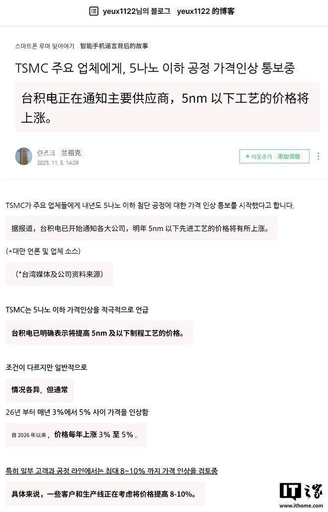 11 月 7 日消息,消息源 yeux1122 昨日(11 月 6 日)发布博文,称苹果 iPhone 18 系列恐面临芯片成本上涨压力。苹果主要芯片供应商台积电(TSMC)计划从 2026 年起,针对 5 纳米以下的先进芯片制造工艺提价 3-10%。