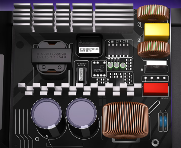 GX Bronze V2延续了前代产品的六边形网盖散热设计,进一步提升气流效率,通风率较以往提升80%。电源尺寸为140 x 150 × 86 mm,内置12cm智能温控风扇,最高转速达1800±10% RPM,运行噪音控制在45分贝以内。结构方面采用主动PFC与DC-DC架构,搭配105℃全日系电容,在230V电压环境下,COC转换效率于典型负载下接近90%。