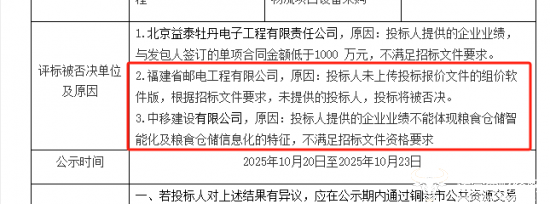 值得一提的是,项目否决情况显示,有三家单位被否决:其中,福建省邮电工程有限公司因未上传投标报价文件的组价软件版,被否决;中移建设有限公司因提供的企业业绩不能体现粮食仓储智能化及粮食仓储信息化的特征,不满足招标文件资格要求,也被否决。