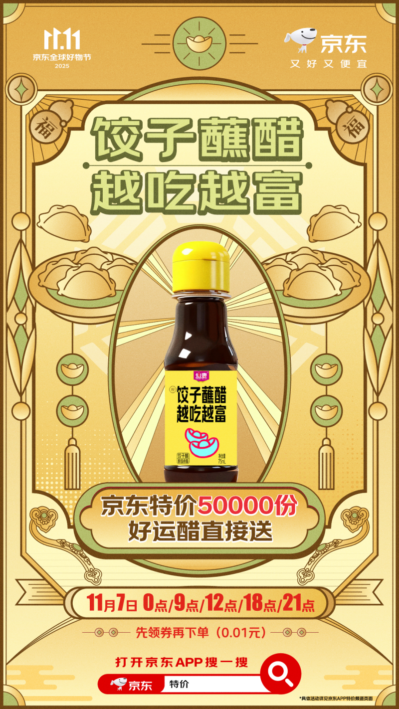 当天,京东特价频道还将送出5万份“好运醋”。消费者在当天0点、9点、12点、18点、21点,点击京东APP左上角进入“特价频道”,即可领券以0.01元的价格购买一份好运醋。