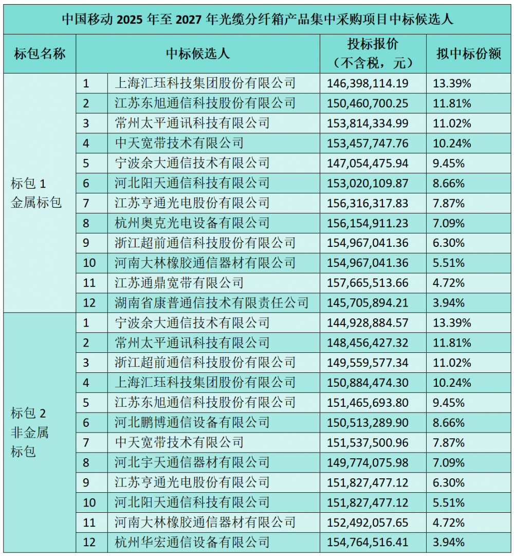 C114讯 11月7日消息(九九)中国移动采购与招标网日前发布2025年至2027年光缆分纤箱产品集中采购项目中标候选人公示,上海汇珏科技集团股份有限公司、江苏东旭通信科技股份有限公司等15个厂商中标。