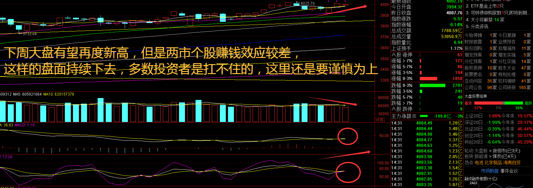 上证指数周五在5日线之上调整,趋势上还是向上的,但是多数个股早已经调头向下,做盘难度提升,已经不适合普通投资者随意参与了。外资机构近期积极聚焦“十五五”规划建议,高盛本周一还上调了对中国出口增速和国内生产总值(GDP)增速的预测。接下来注意上证指数能否在4000点之上稳住。