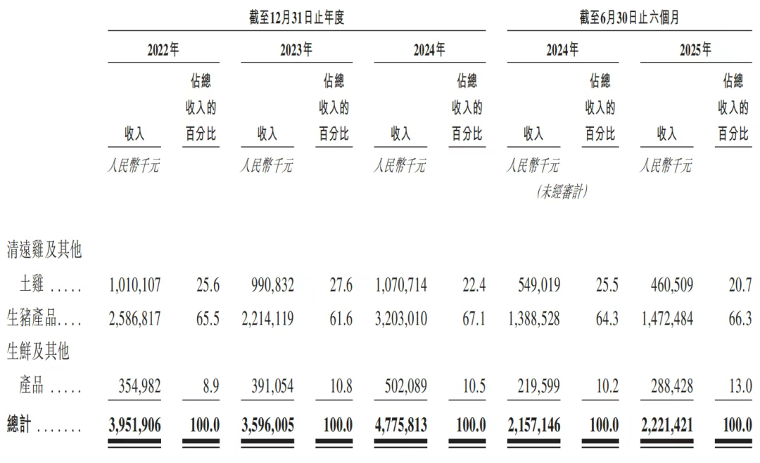 首先在收入占比上,2022年至2024年,公司生猪产品分别贡献了65.5%、61.6%、67.1%的收入,同期清远鸡及其他土鸡的收入占比仅分别为25.6%、27.6%和22.4%,2025年上半年进一步下降至20.7%。