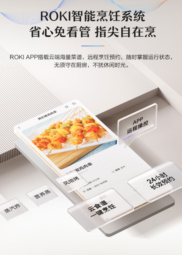 担心自己厨艺不够,做不出好吃的?别慌,它搭载Roki智能烹饪系统,就是你的 “私人烹饪老师”。系统内置51 道智能菜单,从清蒸排骨、蒜香烤虾到无油炸鸡、葡式蛋挞,涵盖家常硬菜、小吃甜点,你只需按照提示放入食材、按下启动键,就能等着复刻大厨级美味,彻底告别 “照着食谱也做砸” 的尴尬。机器还配备8.7英寸触控幻彩屏,屏幕尺寸够大,蒸、烤、炸智能菜单等功能一目了然,老人小孩都能轻松操作,再也不用对着密密麻麻的按钮犯愁。