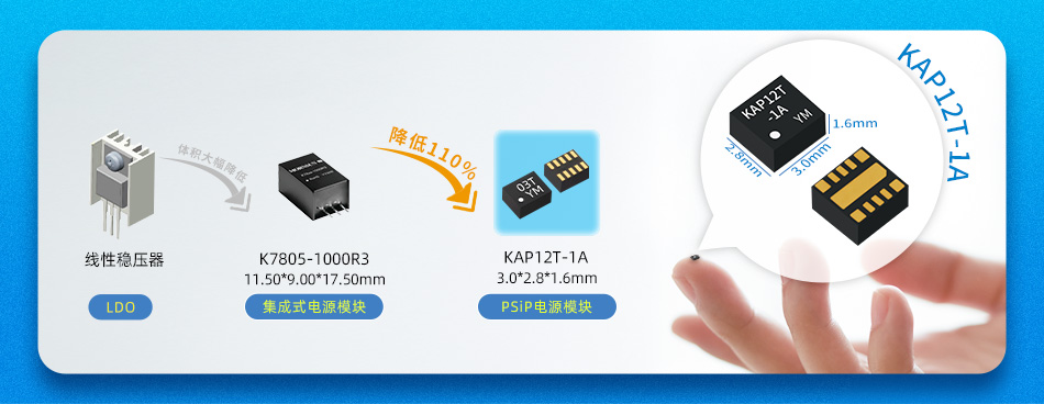 金升阳非隔离PSiP电源KAP系列采用业界先进DFN封装工艺技术,以“小”著称。前有KAP05_T-1A体积小于1颗1206电容,仅2.5 x 2.0 x 1.2 mm;今KAP12T延续系列特点,体积仅3.0 x 2.8 x 1.6 mm,较常规K78产品(11.50 x 9.00mm)占板面积下降了110%,完美满足电子消费等领域追求极致体积的需求。