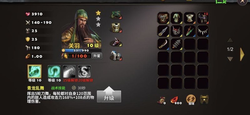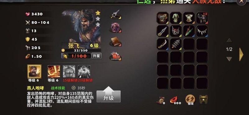 选用关羽与张飞出战(同时为张飞提升等级),搭配天雷塔和火焰塔进行防守,战术卡配置破敌、练兵、术塔精通及三昧真火,二人装备参照所示图例。