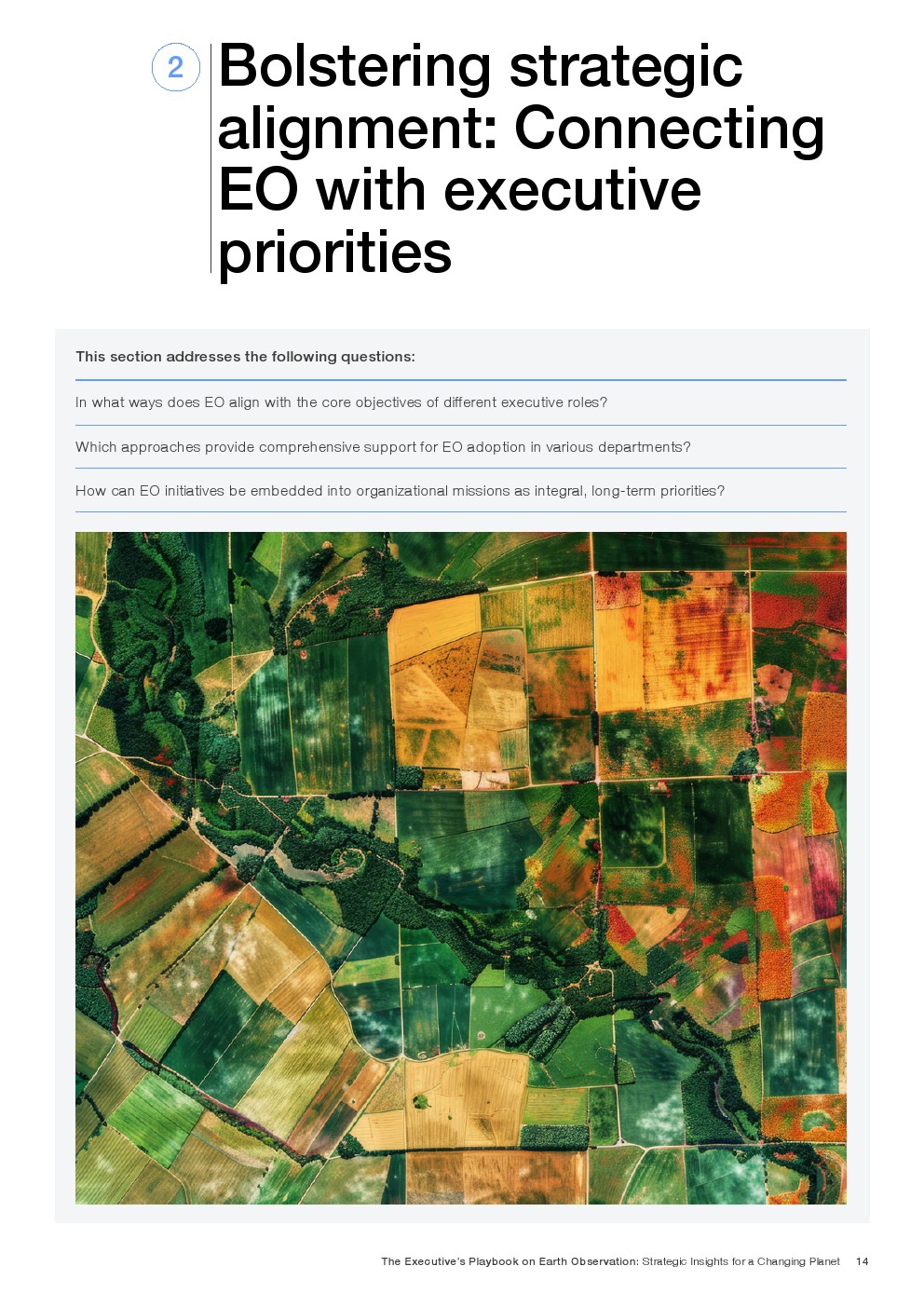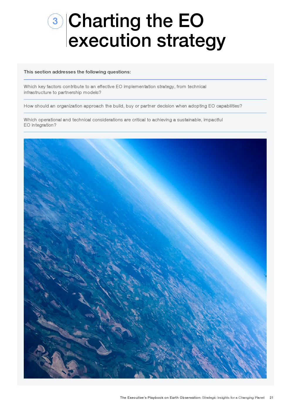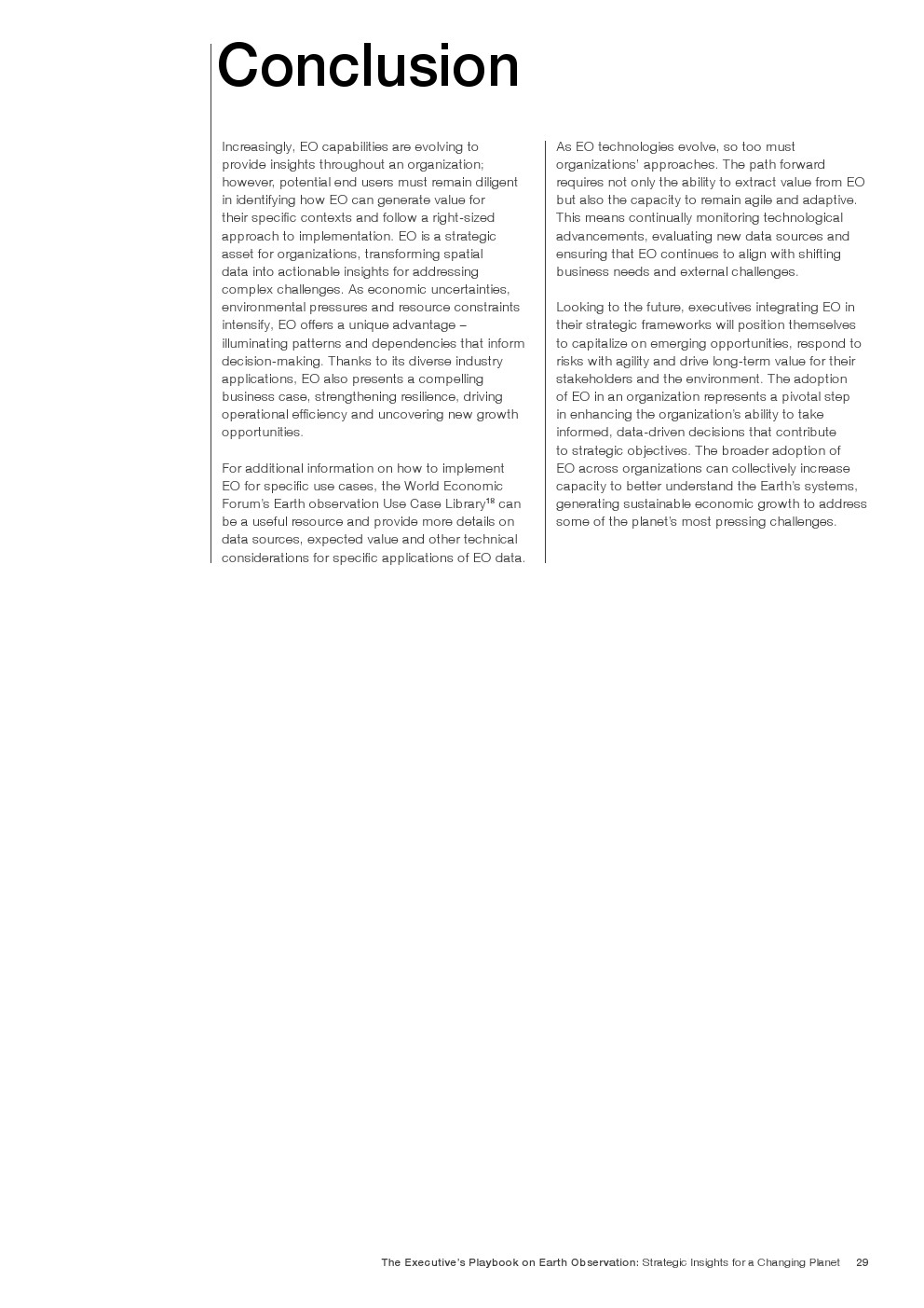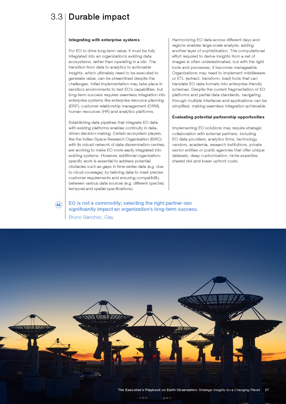 由于EO的潜在应用几乎是无限的,最终用户可以通过了解它最适合提供价值的地方和方式来获得竞争优势。释放EO的潜力需要与组织目标保持战略一致,清晰地识别高价值应用程序,以及超越传统技术采用框架的细致入微的实施方法。