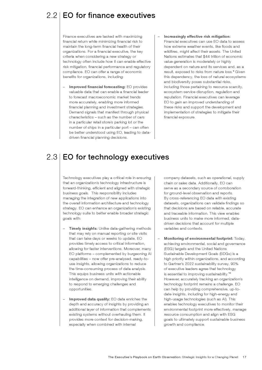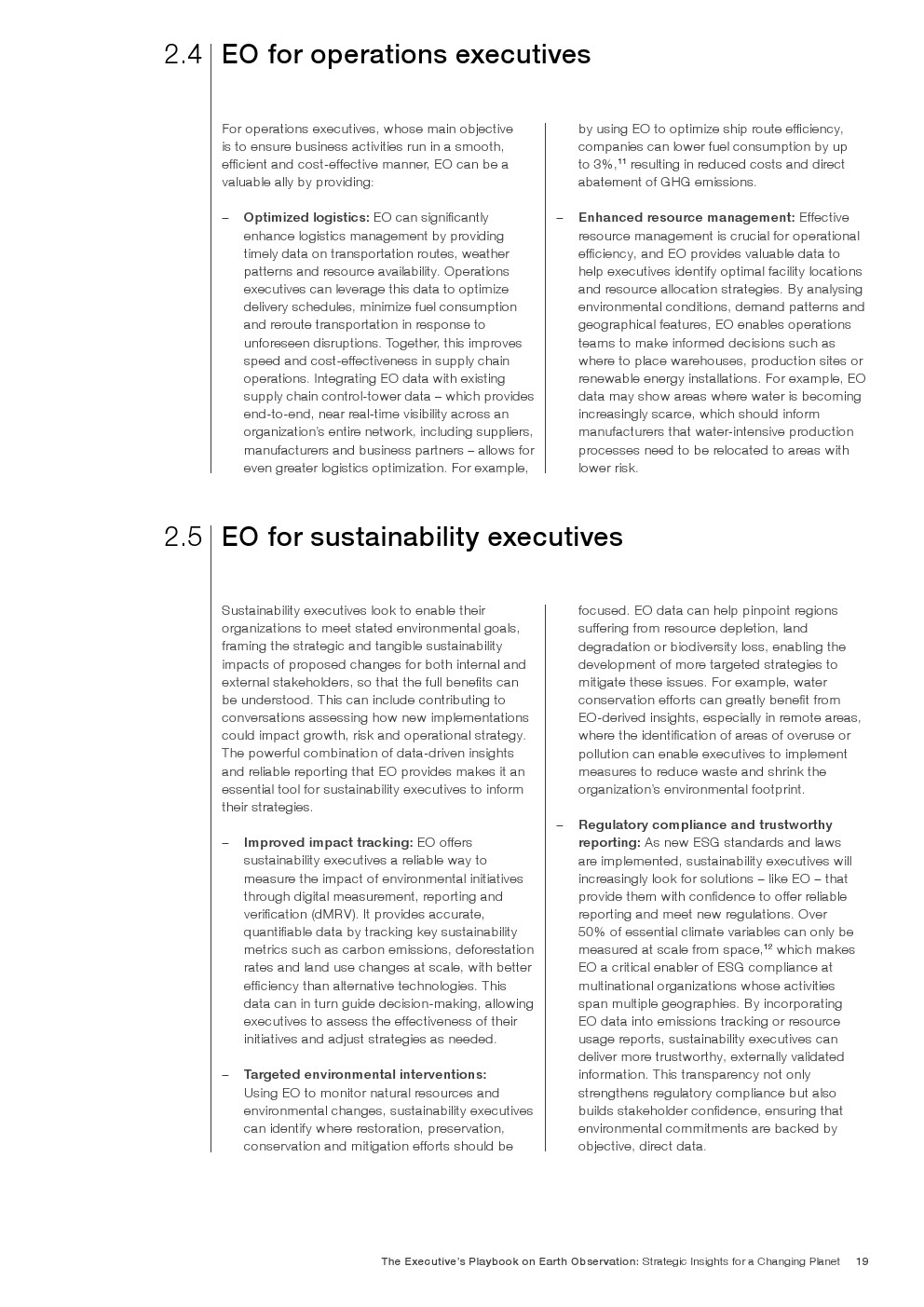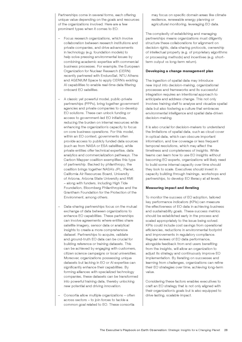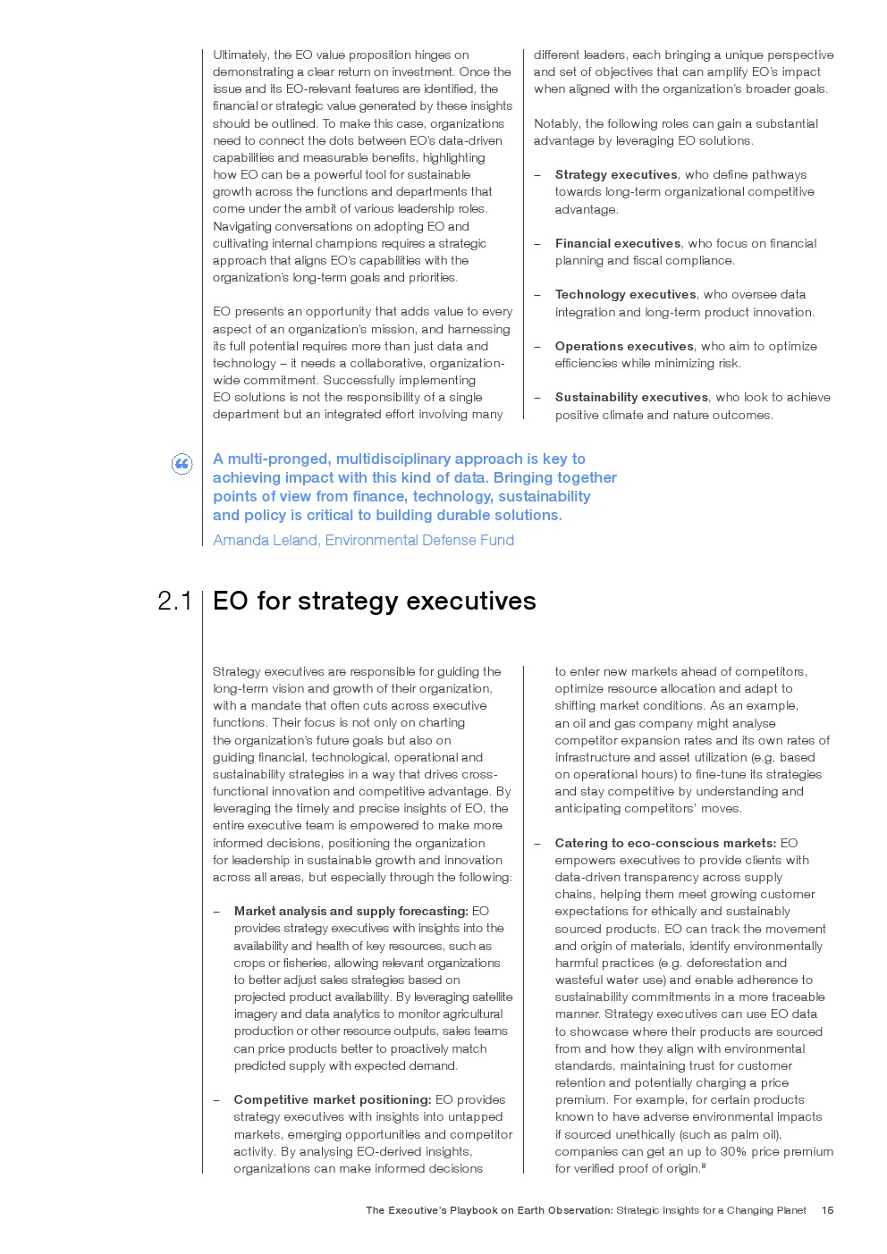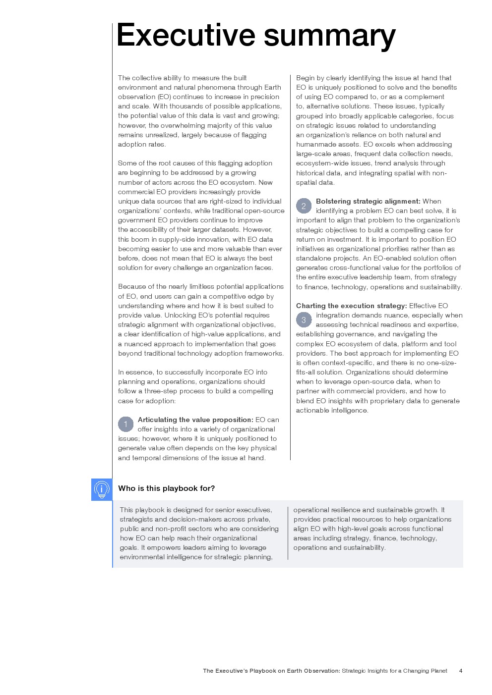由于EO的潜在应用几乎是无限的,最终用户可以通过了解它最适合提供价值的地方和方式来获得竞争优势。释放EO的潜力需要与组织目标保持战略一致,清晰地识别高价值应用程序,以及超越传统技术采用框架的细致入微的实施方法。
