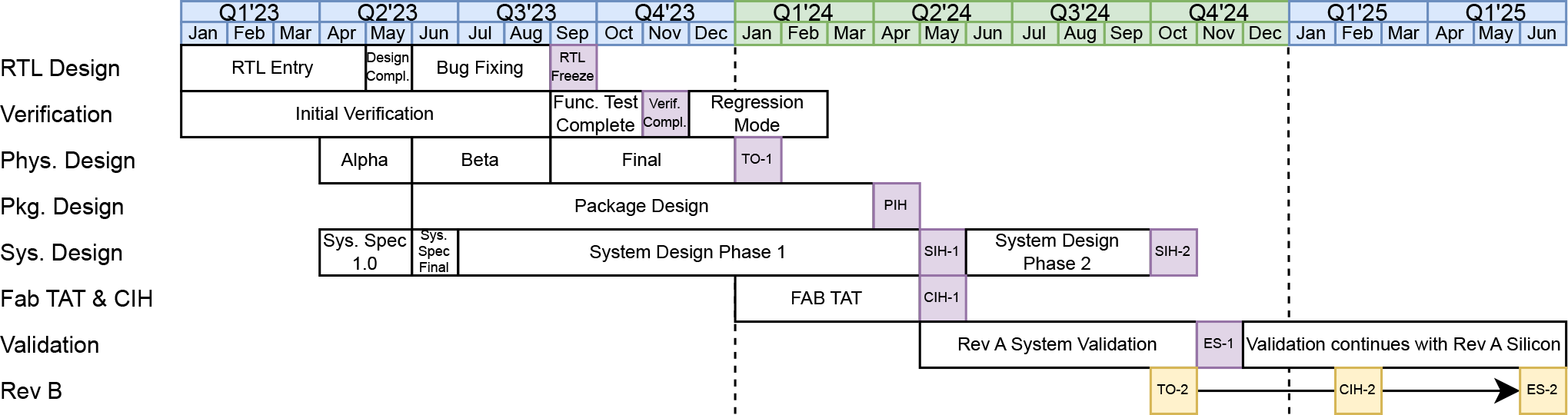 **开发时间线。**图 1 展示了从 RTL 到芯片上板(bring-up)的开发流程,典型周期大约为 18 个月。这表明创建新芯片并非必须耗费多年,技术行业内的多类型组织均有能力完成。