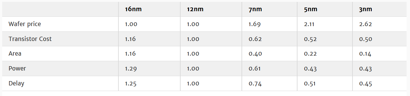 晶体管成本:16nm=1.16,12nm=1.00,7nm=0.62,5nm=0.52,3nm=0.50;