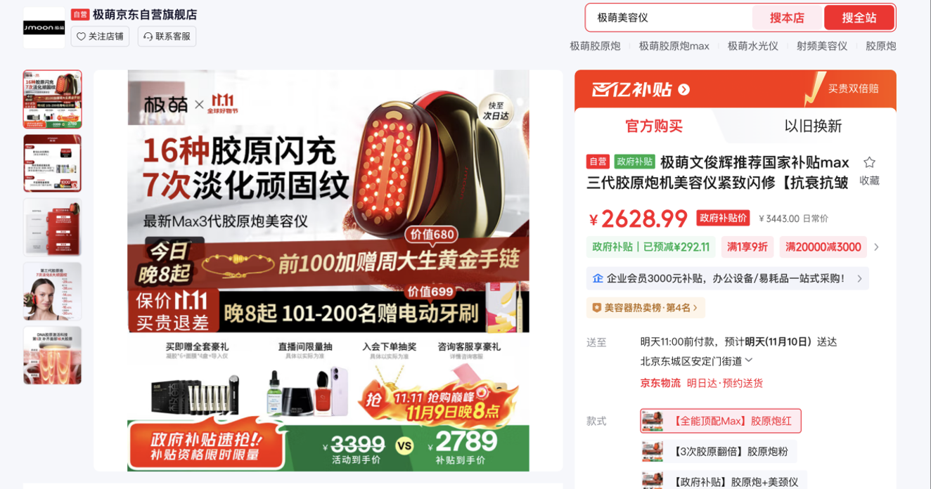 肌肤护理同样需要专业装备。极萌max三代胶原炮机美容仪,采用超光子胶原促生科技,第1次补全全脸所需的16种胶原,还能提拉紧塑,解决脸部下垂问题,补贴后到手价2628.99元,购买还赠面膜4盒、凝胶6支和导入仪,保价11.11,让您安心享受专业级家居护理。