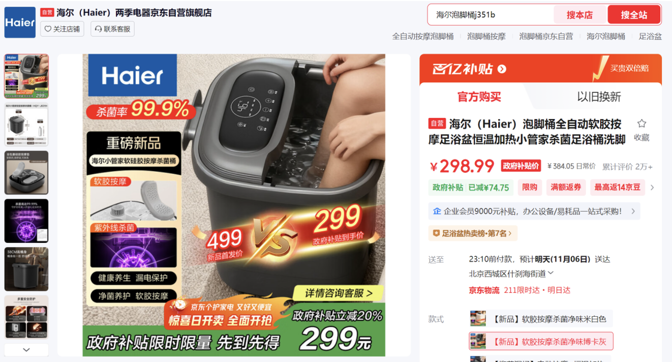 海尔小管家软胶按摩杀菌泡脚桶,让温暖从足底开始蔓延。这款泡脚桶采用全包裹硅胶按摩垫,贴合足弓脚掌,不易磨伤起泡,全自动按摩设计覆盖足底部位,杀菌率99.99%,深层洁净更安心。京东11.11期间享限时限量补贴立减20%,到手价仅需299元,买贵双倍赔,还送足浴包。在这个秋冬时节,给疲惫的双脚一个温暖的拥抱,让每一天都从足底舒适开始。