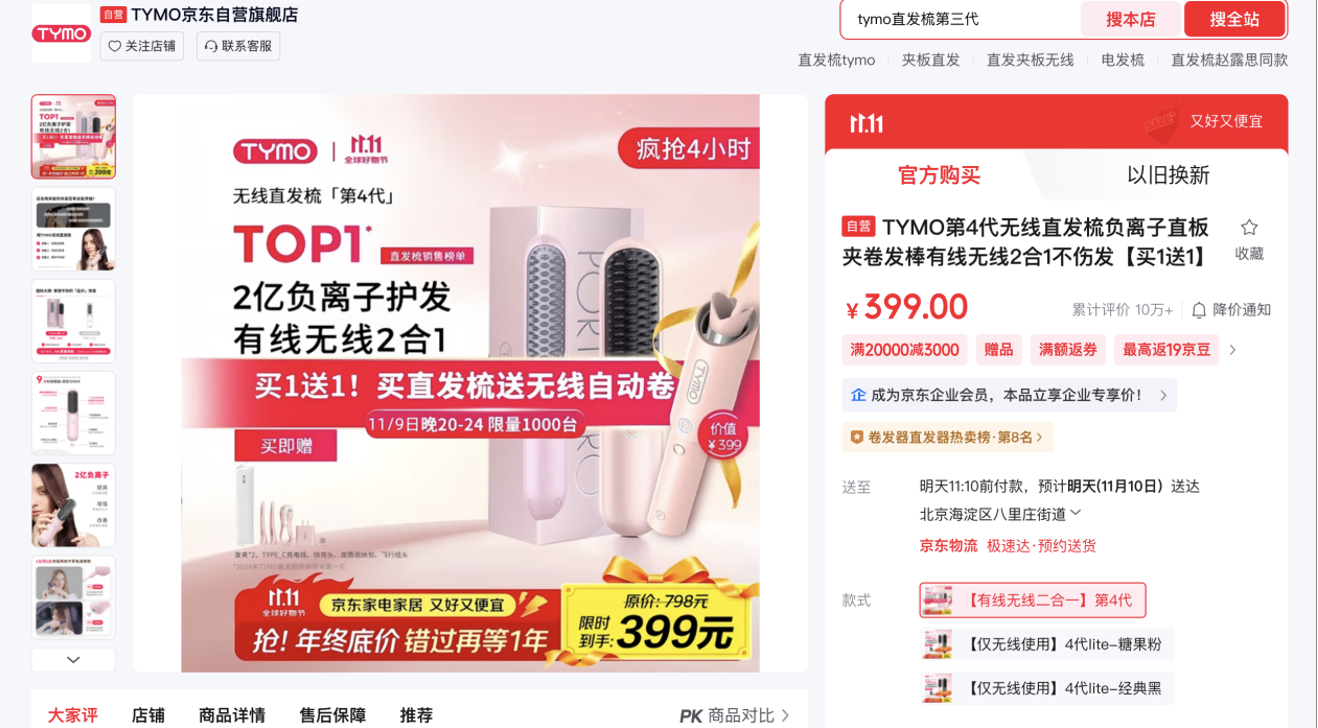 除智能吹风机外,直发梳产品也备受消费者青睐,TYMO第四代无线直发梳,有线无线2合1,告别电量焦虑,2亿负离子持续输出,快速中和静电,一梳即顺。3档温控,适合各种发质需求,快速塑造顺直、高颅顶、八字刘海等发型。限时5折到手价399元!现在下单即赠无线自动卷发棒,加入店铺会员还享有1年以换代修服务。