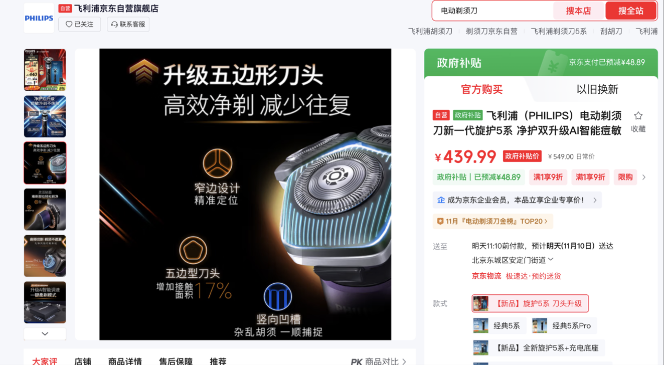 男士护理也不容忽视。飞利浦电动剃须刀新一代旋护5系采用五边形刀头,增加接触面积17%,360度灵活刀头完美贴合面部轮廓,AI智能调速,舒适减少震感,每分钟切剃350万次,瞬息全净剃,补贴后预估到手价440元,会员下单还赠20元京豆。